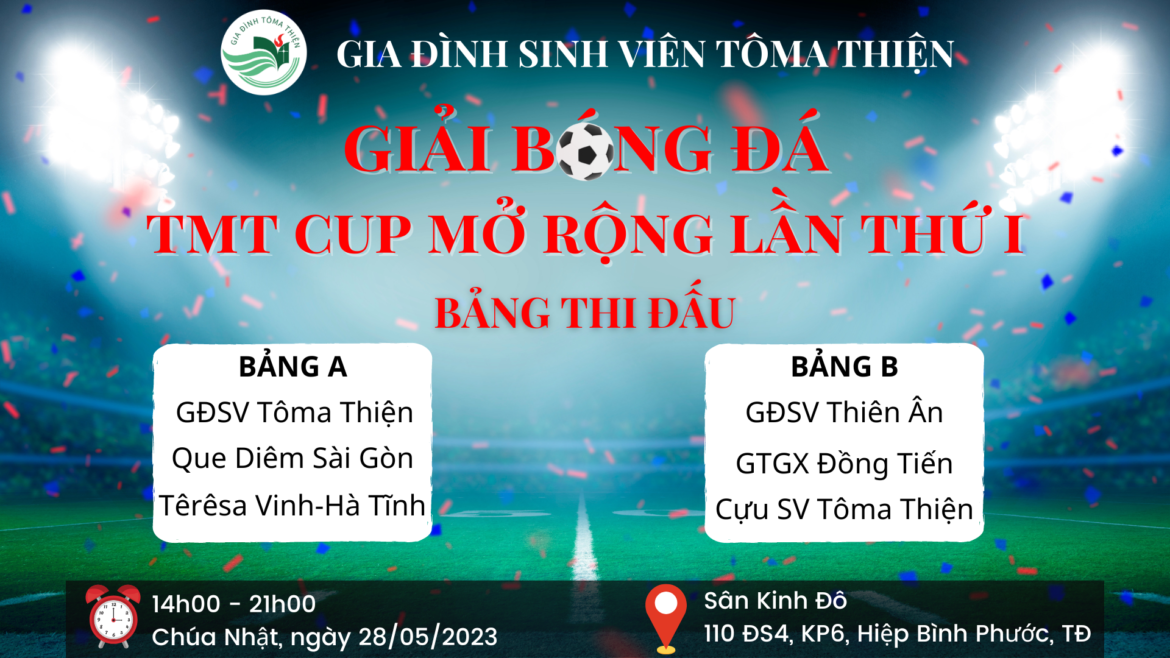 Tiếp nối thành công của giải bóng đá Tôma Thiện Cup truyền thống, được sự cho phép của Cha Linh hướng, Ban Đại diện TMT tổ chức GIẢI TÔMA THIỆN CUP MỞ RỘNG LẦN THỨ I NĂM 2023.